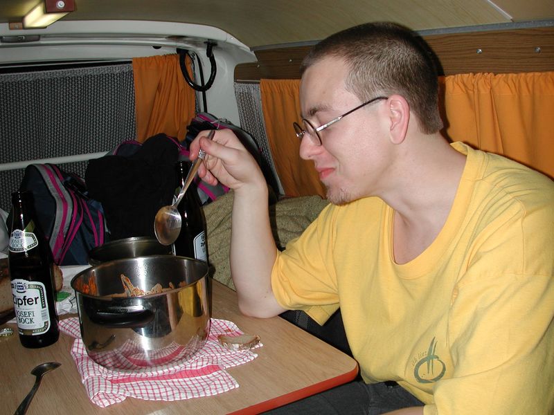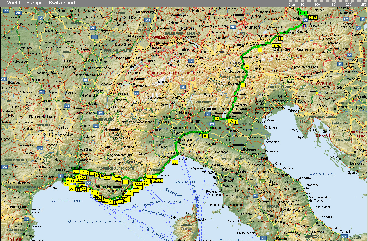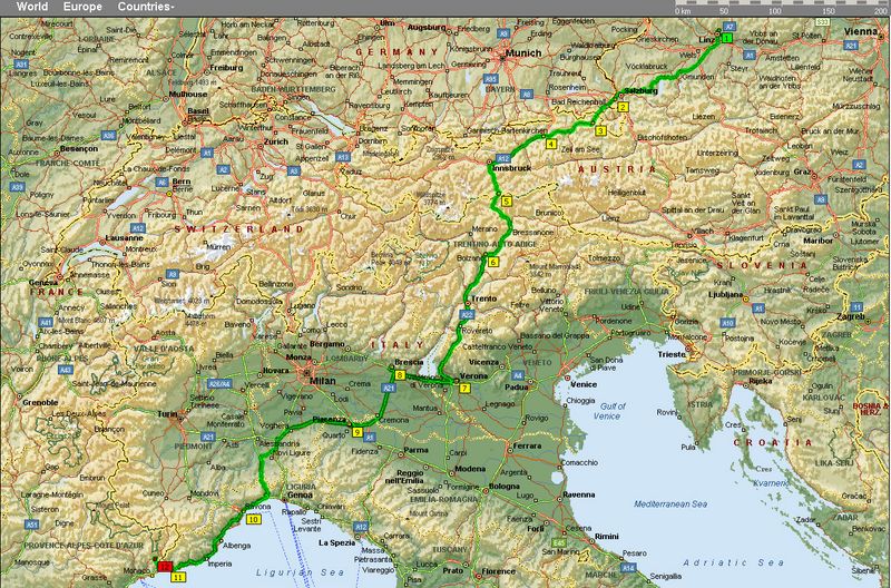 3:30 Uhr morgens früh, also mitten in der Nacht, wurde unser Bus mit dem letzten reiserelevanten Zeug voll gestopft und bei Regen ging es dann um 4:00 Uhr los. Der gute Isildur hatte am Vorabend (schlauerweise) beschlossen das es sich überhaupt nicht auszahle kurze 3 Stunden zu schlafen und legte sich überhaupt nicht nieder. So mußte dann Michi um einiges mehr als die Hälfte der an diesem Tag zurückgelegten 1000 km fahren, während Herr Isildur ein wenig vor sich hin döste.Am Brenner ließen wir das triste Wetter Österreichs zurück. Über 20°C (die des öfteren im Verlauf der Reise auf 30°C (!!) anstiegen) machten den Griff zur Sonnencreme notwendig.